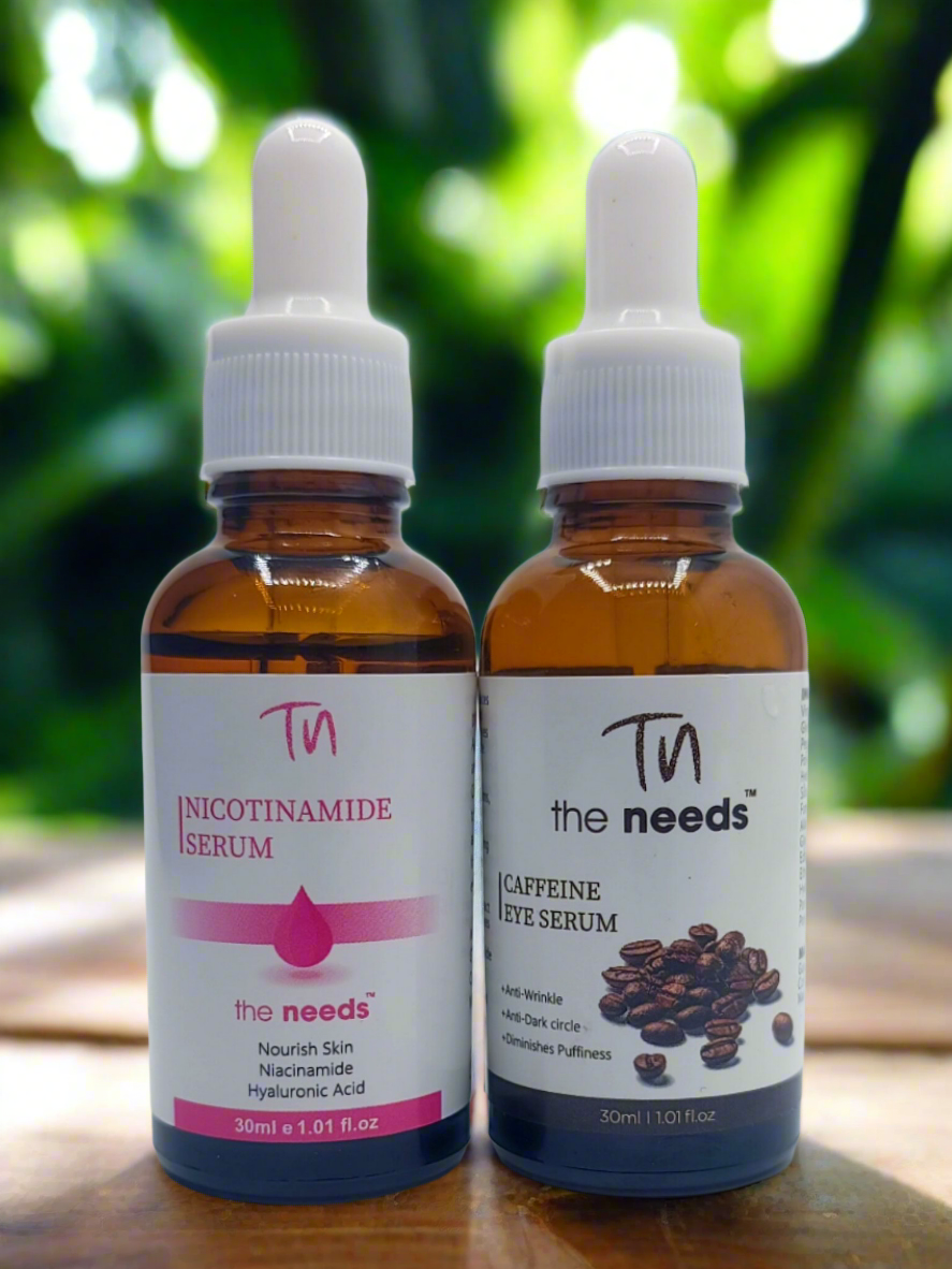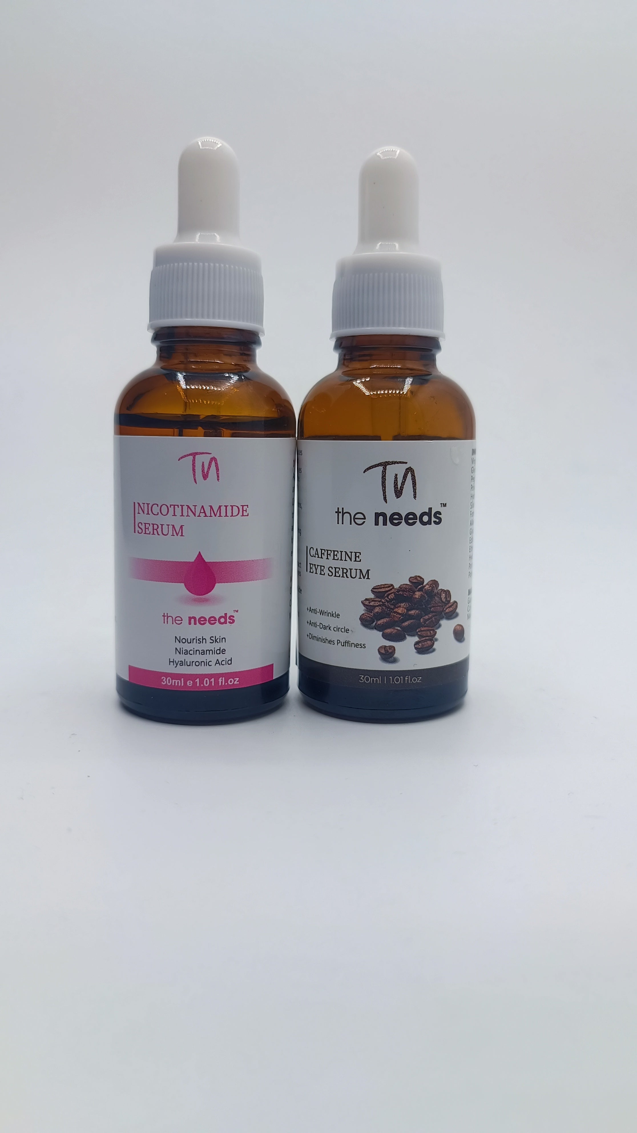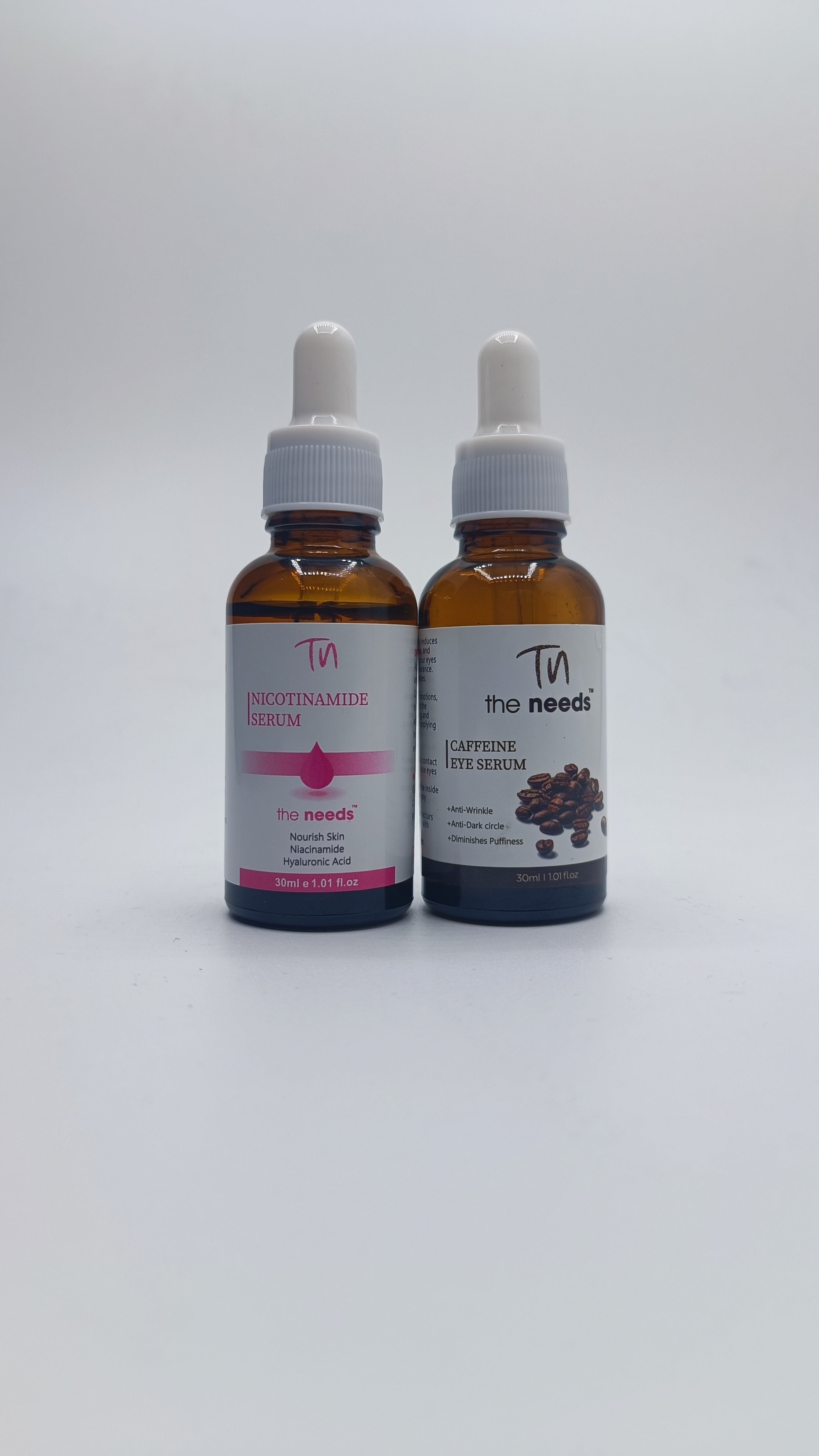 The Caffeinated Glow-Up Duo by The Needs is your daily boost for brighter, smoother, and younger-looking skin. This powerful pair combines the brightening and pore-refining benefits of Nicotinamide Serum with the targeted care of Caffeine Eye Serum to reduce dark circles, puffiness, and fine lines around the eyes.